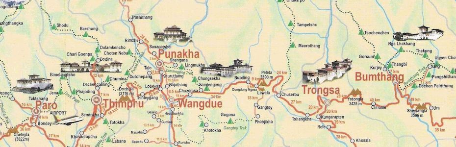 | We followed a long easy track downhill past the Trashigang gompa, then another 3 miles on a dirt track down to the road to meet our bus, for the half-hour drive to our large city-center hotel in Thimphu (capital of Bhutan). | |||