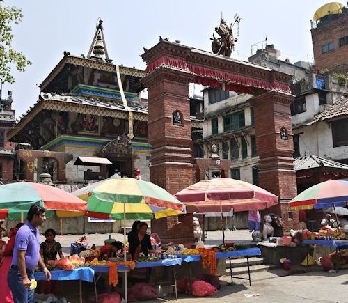 An evening take-off for the overnight 9-hour flight Heathrow to Delhi; delayed take-off, then 'dinner' served after midnight, so only managed a half-hour snooze. In the morning, a 3-hour wait in transit before boarding our plane to Kathmandu. Too hazy to get good views of the mountains. For our overnight stay in Nepal, we had to fill in immigration forms, as well as queuing to have our visas stamped. A short drive to the Dwarika hotel in Kathmandu; quite posh, but in a very grotty area. Our room was enormous, with 4-poster bed and sunken bath, but too tired to appreciate it. We were also too tired for an expensive hotel dinner, but found nowhere else to eat nearby; so we just had coffee and a snack in our room, then bed at 7pm (= 2pm UK time!). Too much noise from a poolside barbecue outside our window meant we still needed ear-plugs for sleep. |